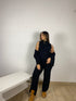 Coordinato in lanetta composto da 3 pezzi: pantalone, top giromanica alto collo e cardigan. Veste fino ad una taglia XL