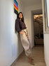 Pantalone balloon. Elasticizzato in vita, con bottone. Porta una cintura in tessuto.