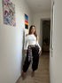 Pantalone balloon.Elasticizzato in vita, con bottone. Porta una cintura in tessuto